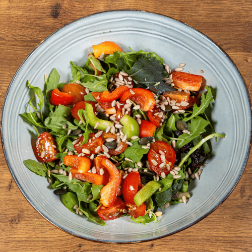 Verschiedene Blattsalate mit Kirschtomaten, Gurke, Paprika und Kernemix.